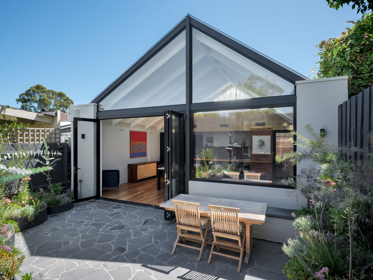Courtyard with bluestone paving and charcoal batten screen conceals the rear carport. Bifold doors open the extension onto the garden, with a masonry bench seat to anchor the outdoor table – a place to rest and take in Kurt Wilkinson’s innovative native garden design.