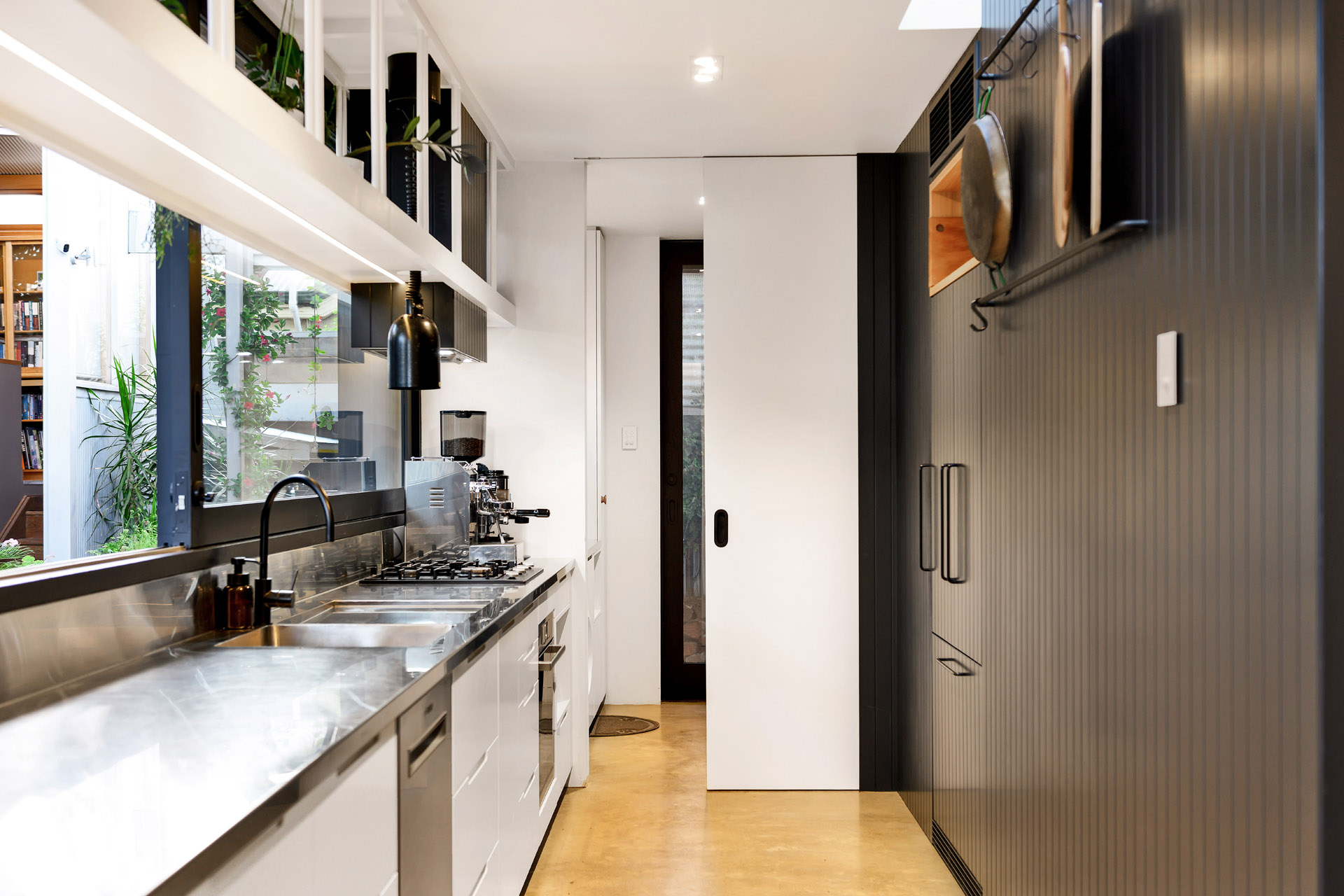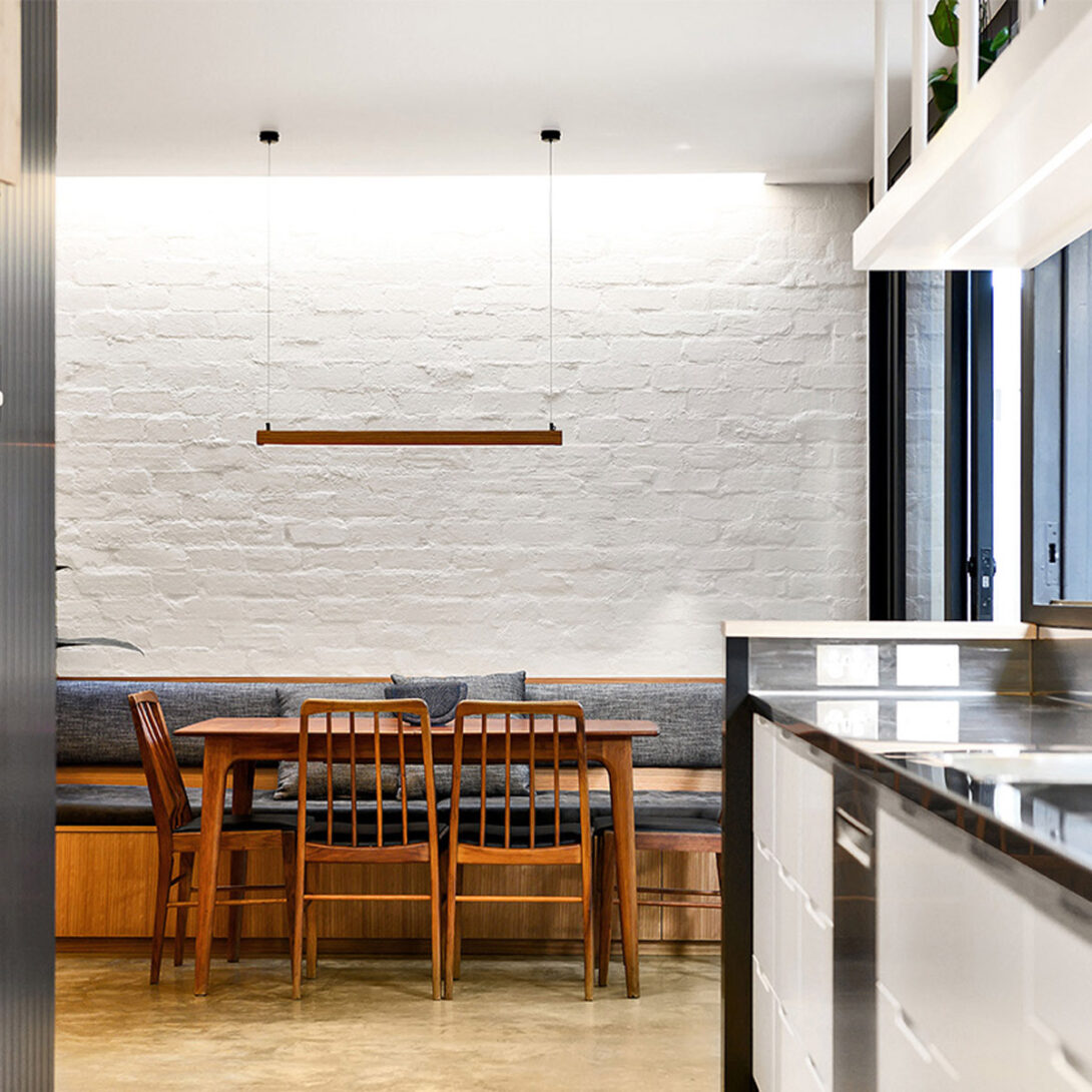 Smart spatial planning drove the interior design: a banquette seat anchors the dining area, providing built-in flexibility, while a galley kitchen with a large sliding servery window connects indoors to out, maximising both function and flow within a compact footprint.
