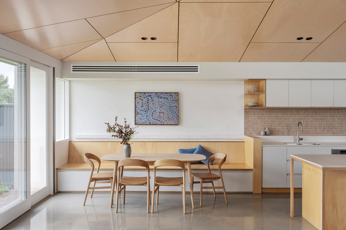 A feature plywood ceiling defines the main living area, extends seamlessly from the interior to the exterior, rising and opening to the north and east to capture optimal sunlight, enhancing spatial volume and introducing warmth and texture to the interior.